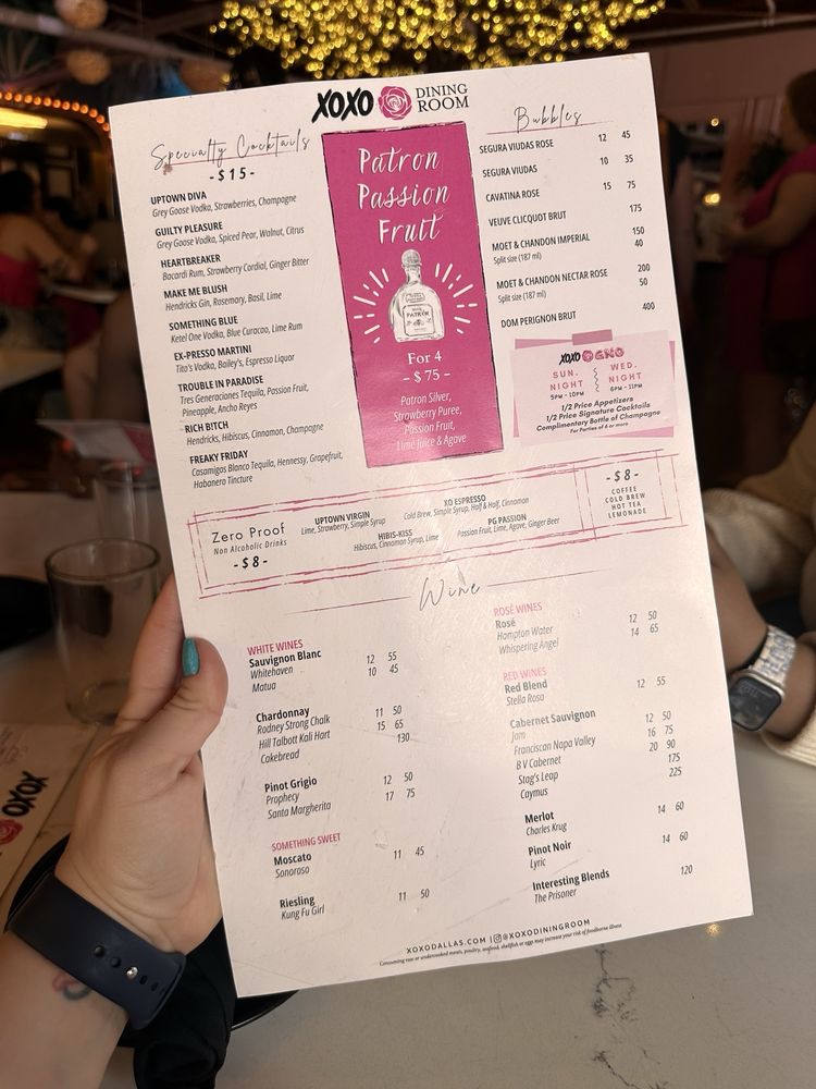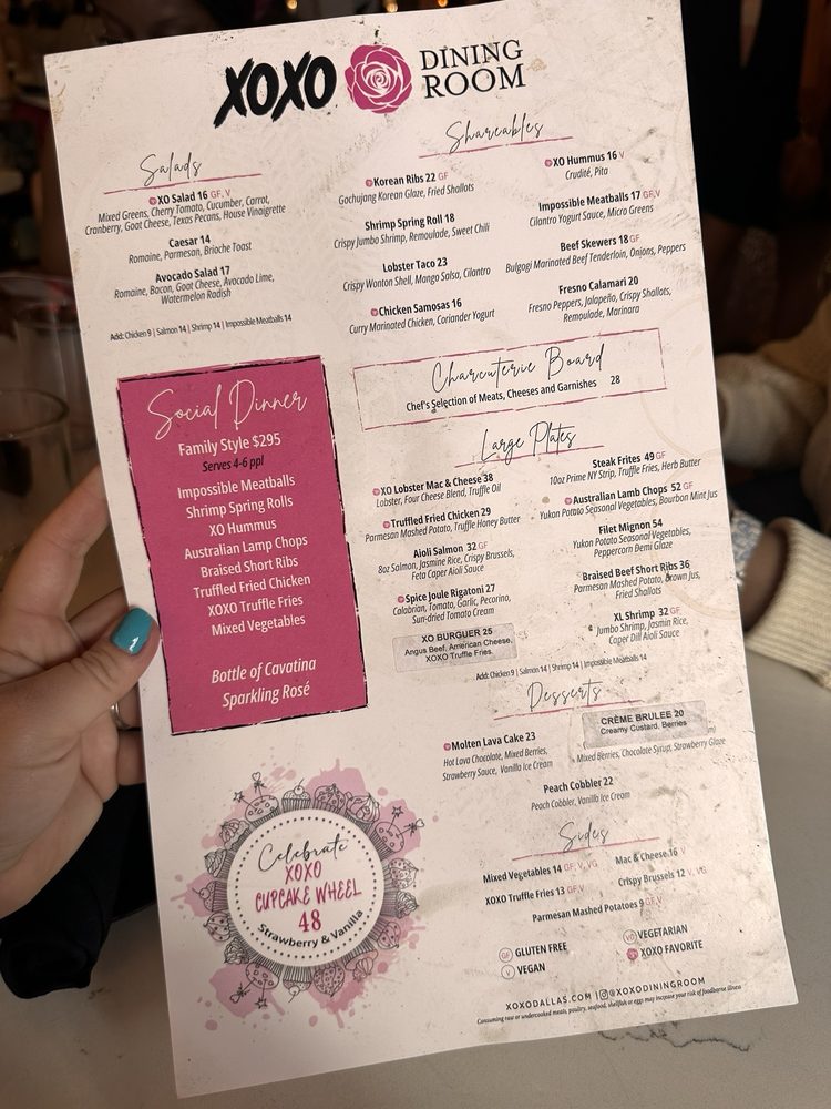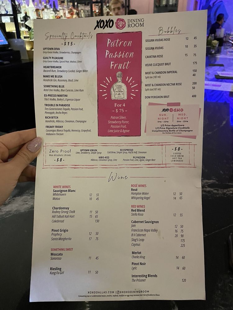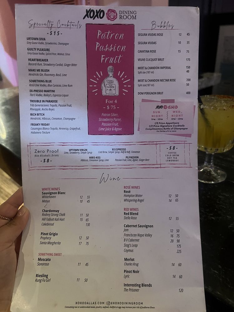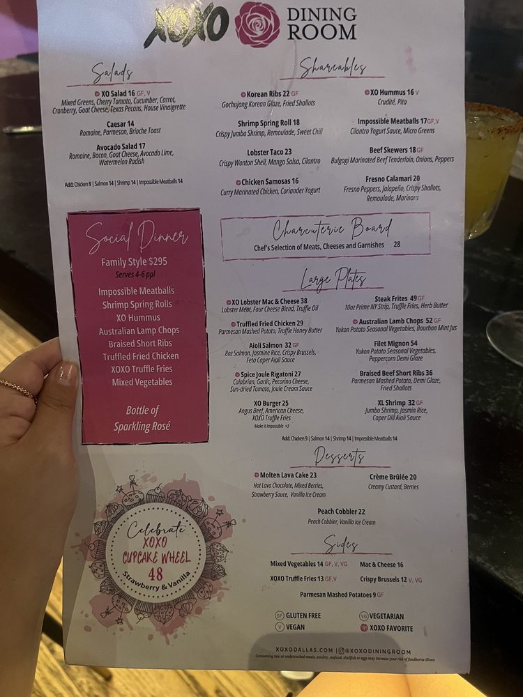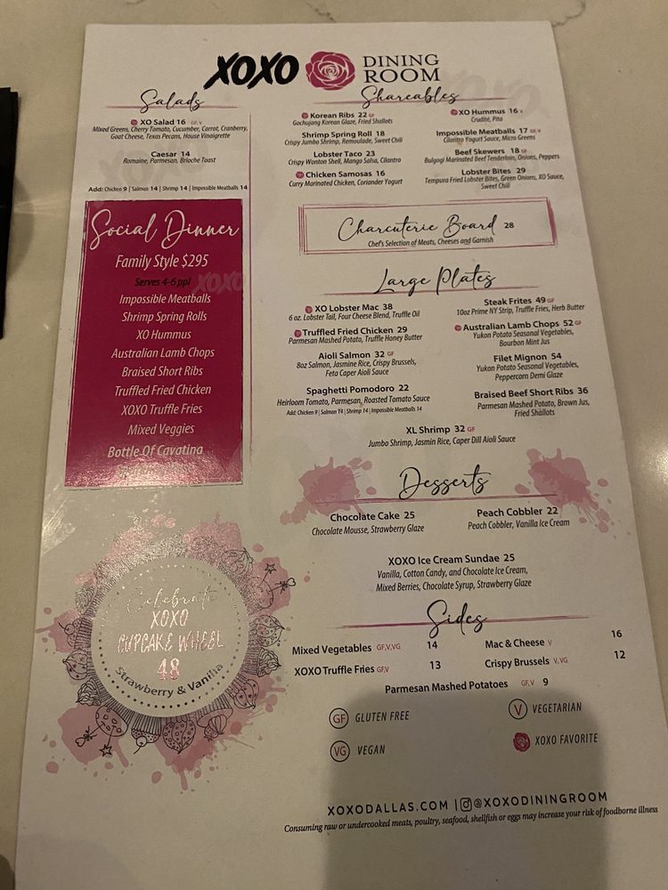 Welcome to XOXO Dining Room, a trendy and upscale New American restaurant located in Dallas, TX. This women-owned establishment offers a variety of vegan and vegetarian options, as well as a full bar and private dining experience. The menu features small plates like Arancini Truffle and Tom Yum Shooters, along with salads like Caesar Salad and Unwedged Iceberg Salad. For main courses, try the Ricotta Gnocchi or the Grilled Fish and Chips.